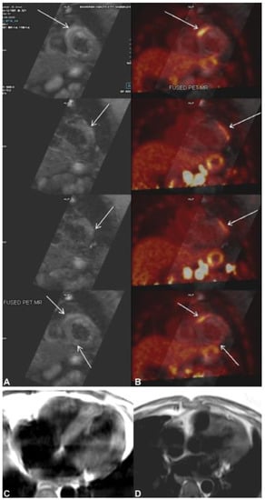 (A) Cardiac magnetic resonance (CMR) shows multifocal subepicardial to mid-myocardial linear enhancement along the right ventricular insertion site, mid-anterolateral, and inferior segments (arrows) with corresponding focal myocardial edema. (B) Fused cardiac positron emission tomography CMR shows patchy areas of increased 18F-flurodeoxyglycose (FDG) uptake in the apical to mid-anterolateral, mid-to-basal anteroseptal at the right ventricular insertion site, and mildly increased FDG uptake in the apical inferior segments of the left ventricular myocardium corresponding to the regions of myocardial enhancement seen on CMR. (C,D) T2 black blood image showing T2 hyperintense changes in the left ventricular myocardium. The image was adapted from [61].