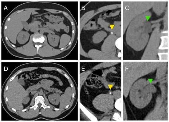 CT images acquired with the photon counting CT (PCCT, A–C) and with the standard CT (S40, D–E). Yellow arrowheads (B,E) indicate ureter stones in both patients. Green arrowheads (C,F) point to the dilated renal pelvis due to the ureter obstruction.