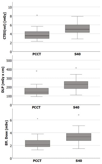 Box plots showing the median, the lower (Q1), and upper (Q3) quartile, as well as the interquartile range * 1.5 (whiskers) of the computed tomography dose index (CTDIvol), the dose length product (DLP) and the effective dose of CT examinations with the photon counting CT (PCCT) and the standard CT (S40). Differences between CT scanners were statistically significant for all dose indices.