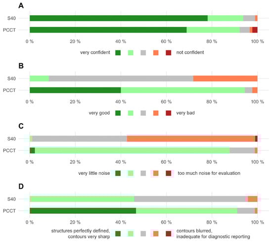 Horizontal stacked bar chart displaying the qualitative image analysis. (A) Diagnostic confidence. (B) overall image quality. (C) image noise. (D) image sharpness. PCCT = photon counting CT, S40 = standard CT.