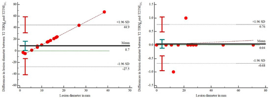 Bland-Altman plot to display the differences in the measurements of the lesion diameter between the T2-weighted TIRMStd and the TSEDL in reader 1 (left) and reader 2 (right).