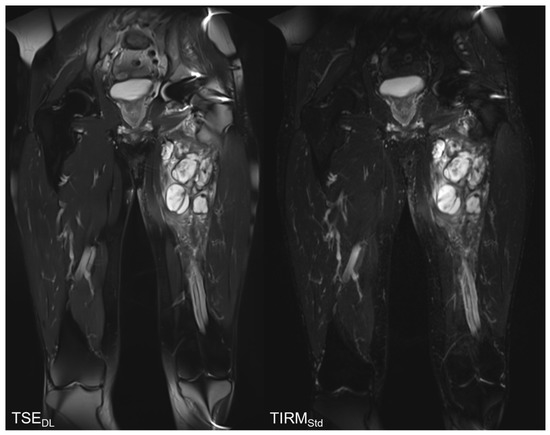 All MRI examinations were performed in clinical routine using 1.5 and 3 T scanners (MAGNETOM Vida, Prismafit, Aera, and Avanto, Siemens Healthcare, Erlangen, Germany). Patients were examined in a supine position using a 32-channel spine coil and an 18-channel body coil array. The study protocol consisted of the following sequences: 1. Standard coronal T2w T2 Turbo inversion recovery magnitude (TIRMStd) with fat suppression. 2. Deep learning-accelerated T2w TSE (TSEDL) with spectral fat suppression based on a prototype. Detailed imaging parameters are displayed in Table 1 and Table 2. All MRI examinations were performed using a body-weight-adapted intravenous contrast agent injection (0.1 mmol/kg gadobutrol) (Gadovist, Bayer Healthcare, Berlin, Germany) with a flow rate of 1.5 mL/s followed by a saline flush of 20 mL.