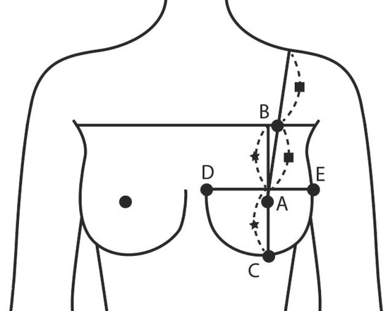 - Lewin, R.; Amoroso, M.; Plate, N.; Trogen, C.; Selvaggi, G. The aesthetically ideal position of the nipple–areola complex on the breast. Aesthetic Plast. Surg. 2016, 40, 724–732. [Google Scholar] [CrossRef]