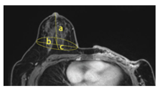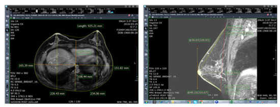 For MRI, breasts are in an ellipsoid shape drooping downwards, and thus the volume was measured with the assumption that it is in the ellipsoid shape. MRI images showed the shape of 1/2 ellipsoid sagging downward, and thus the 1/2 ellipsoid volume formula was applied (Formula (2)). This is the MRI volume calculation formula (Figure 7).