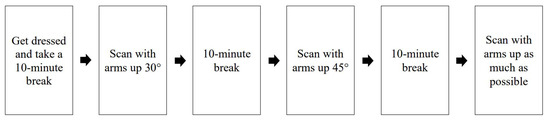 Data for the 3D-SIM were collected from four participants who volunteered to participate in this study (IRB No. 1808/003-001). The measurements were taken from 2 to 17 November 2018. The participants were to hold up their arms to 45°, 90°, and stretch as upward as they could, which are anthropometric postures, while a 360° upper body scan was conducted. The scanning of each motion took approximately 45 s. They were to inhale and remain still for as long as they could so that the rib cage was not expanded while scanning. There was a 10-min break between motions so that the participants could relax. The 10-min break was based on the speed of saving the 3D images, while also referring to previous studies on measuring bra stress [42,43,44] that designated the pause between protocols as 10 min. The process of 3D-SIM is shown in Figure 3.