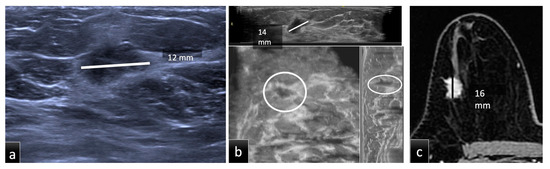 - Gruber, I.V.; Rueckert, M.; Kagan, K.O.; Staebler, A.; Siegmann, K.C.; Hartkopf, A.; Wallwiener, D.; Hahn, M. Measurement of tumour size with mammography, sonography and magnetic resonance imaging as compared to histological tumour size in primary breast cancer. BMC Cancer 2013, 13, 328. [Google Scholar] [CrossRef]