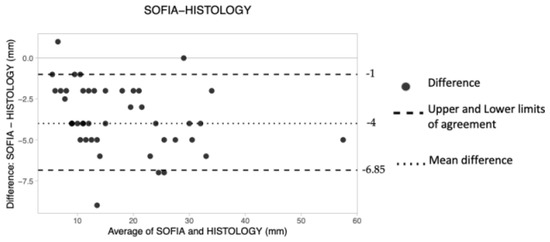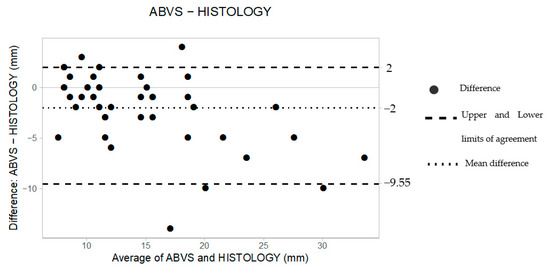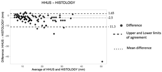 The Bland–Altman scatter plot shows the agreement of measurements between hand-held ultrasound (HHUS) and histology. Millimeters (mm).
