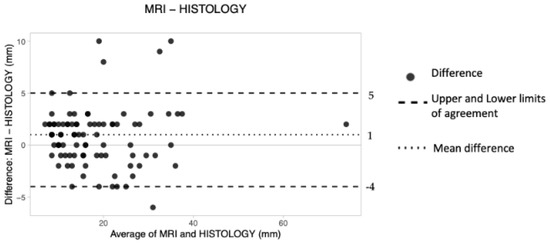 The Bland–Altman scatter plot shows the agreement of measurements between magnetic resonance imaging (MRI) and histology. Millimeters (mm).