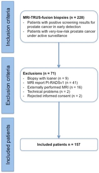 In this prospective study, 157 patients were ultimately enrolled and statistically evaluated out of a total of 228 patients, all of which underwent an MRI/TRUS-fusion prostate biopsy procedure between September 2015 and March 2017 (Figure 1; Table 1).