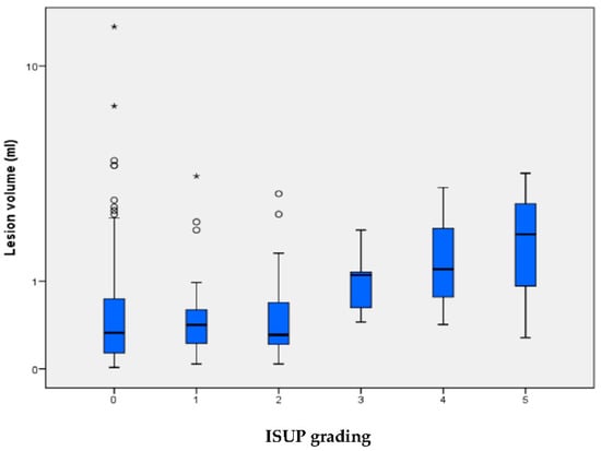 Lesion volume is indicated for each of the ISUP grading groups, for which ISUP 0 signifies no carcinoma/benign histology. The median (±IQR) lesion volume with whiskers within 1.5 times the IQR. Circles are lesions between 1.5 and 3 times, asterisks are lesions with >3 times IQR deviation from the third quartile. One benign outlier with a lesion volume with 42 mL is not depicted in the graphical representation for clearer visualization. The lesion volume correlates with ISUP grading (p = 0.0076, Kruskal-Wallis-Test).