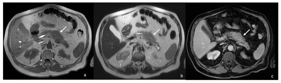 MRI showing focal enlargement of pancreatic body (white arrows) iso-intense on T1w (a) and iso-hyper intense on T2w (b), with homogeneous enhancement after gadolinium-based contrast agent administration (c).