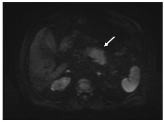 MRI showing focal enlargement of pancreatic body with restricted water diffusion on DWI (b value = 800) (white arrow).
