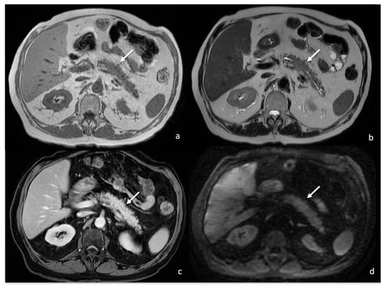 MRI follow-up 1 month after previous examination showing reduction in the previously described focal enlargement of pancreatic body (white arrows) isointense on T1w (a) and T2w (b), with homogeneous enhancement after gadolinium-based contrast agent administration (c) and no restricted water diffusion on DWI ((d); b value = 800).