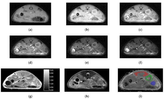 Images generated by the SoS-VFA protocol for flip angles of (a) 2, (b) 5, (c) 8, (d) 12, (e) 16 and (f) 20° were free of motion, had high SNR and yielded high quality (g) T1 maps. The (h) T2 weighted images provided good soft tissue contrast. VOI analysis was performed for three tissue types: (i) muscle (red), kidney (green) and tumor (blue).