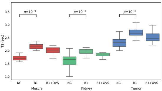 Whisker plots of SoS-VFA T1 estimates generated without B1 correction (NC), with B1 correction but no OVS (B1) and with B1 correction and OVS enabled (B1 + OVS) for muscle (left, red), kidney (center, green) and tumor (right, blue).
