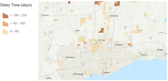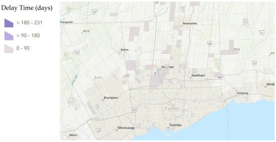 Average Delay Time of Examinations Between the pre-pandemic period (period 1) and during the height of the COVID-19 pandemic period (period 2) of Examinations Per Dissemination Area. A map of Greater Toronto Area, Ontario, Canada with patients aggregated by dissemination area and average delay time (days) calculated for each dissemination was produced by ArcGIS online. Dissemination areas of patients are marked by a gradient based on delay time. The darkest blue shows a delay in examination >180 days while the lightest blue shows a delay in examination <90 days. Dissemination areas with no color have no patient data.