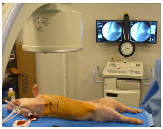 Two control pigs were initially utilized to determine the cyclosporine dose required for tumor model development. They were administered 10 mg/kg/day oral cyclosporine for immunosuppression, starting 7 days prior to the inoculation date. Pigs were anesthetized for the inoculation procedure (induction with 6 mg/kg Telazol and 2 mg/kg Xylazine, maintenance with 2% isoflurane), and the MSTO211 cells were injected into the right lower hemithorax, between the ribs, under fluoroscopy guidance (Siemens, Arcadis, PA) (Figure 1). Cell volume injected was dependent upon the number of cells grown in each colony. Cyclosporine was maintained for 4–12 weeks post-inoculation. The number of cells injected per pig as well as the cyclosporine dose is summarized in Table 1.
