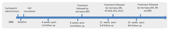For treatment pigs (#3–#13), the cyclosporine dose was increased to 20 mg/kg/day to increase the rate of tumor progression. Procedures followed to generate the tumor model were similar to those described above, with the number of cells and cyclosporine dose summarized in Table 1. All treatment animals were imaged at baseline and followed up every four weeks (Figure 2) using a 1.5T MR clinical scanner (Avanto, Siemens Healthcare, Malvern, PA, USA) with a body array and spine array coil simultaneously (Siemens, Malvern, PA, USA).