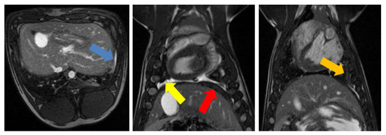 Main mesothelioma findings in MRI. (Left): True fast imaging with steady state precession (FISP) transverse image of pig #8 showing pleural thickening (blue arrow); (Middle): True FISP coronal image of pig #8 showing pleural fluid (yellow arrow) and the increased thickness of diaphragm (red arrow); (Right): True FISP coronal image of pig #8 showing adhesions (orange arrow).