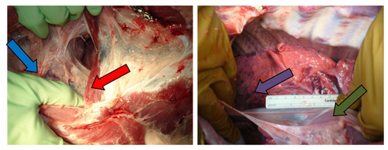 Macroscopic findings during necropsy: adhesions (blue arrow), increased diaphragm thickness (red arrow), abnormal color in the lungs (purple arrow), and increased pericardium thickness (green arrow).
