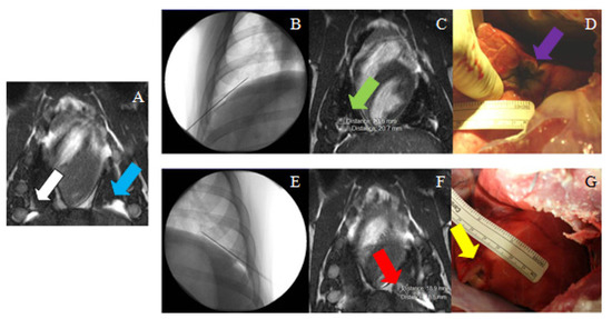 (A) MR image (True FISP) used for treatment planning in the right (white arrow) and the left (blue arrow) sides for pig #4. (B) Needle placement in the right side (fluoroscopy image); (C) post-ablation MRI (True FISP), showing the ablated area in the right side (green arrow); (D) necropsy image showing the ablated area in the right diaphragm (purple arrow). (E) needle placement in the left side (fluoroscopy image); (F) post-ablation MRI (True FISP), showing the ablated area in the left side (red arrow); (G) necropsy image showing the ablated area in the left diaphragm (yellow arrow).