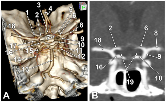 (A) Three-dimensional volume rendering of the skull base, left posterosuperolateral view. (B) Coronal cut through the internal carotid arteries bifurcation. Supraoptic A1 segments of the anterior cerebral arteries. 1. Left optic canal; 2. supraoptic A1 segment of the left anterior cerebral artery; 3. anterior communicating artery; 4. A2 (postcommunicating) segments of the anterior cerebral arteries; 5. right optic canal; 6. supraoptic A1 segment of the right anterior cerebral artery; 7. right ophthalmic artery; 8. right middle cerebral artery; 9. right internal carotid artery; 10. right posterior clinoid process; 11. right posterior cerebral artery; 12. right superior cerebellar artery; 13. basilar artery; 14. left superior cerebellar artery; 15. left posterior cerebral artery; 16. left posterior clinoid process; 17. left anterior clinoid process; 18. left middle cerebral artery; 19. optic nerves.
