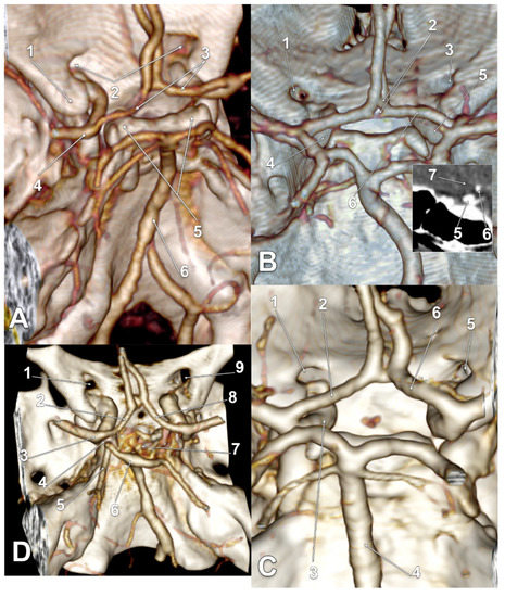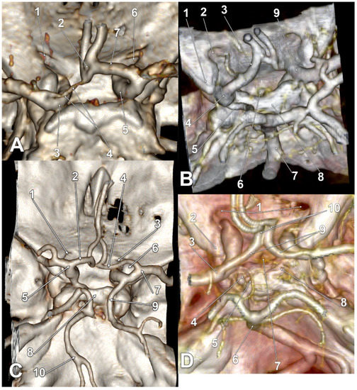 (A) Three-dimensional volume rendering of the skull base, posterosuperior view. Infraoptic, supracarotid and hypoplastic left anterior cerebral artery. 1. Left optic canal; 2. fenestrated anterior communicating artery; 3. left internal carotid artery; 4. A1 segment of the left anterior cerebral artery; 5. right internal carotid artery; 6. right optic canal; 7. A1 segment of the right anterior cerebral artery. (B) Three-dimensional volume rendering of the skull base, posterosuperior view. Bihemispheric infraoptic left anterior cerebral artery. 1. Left anterior clinoid process; 2. left optic canal; 3. bihemispheric left anterior cerebral artery; 4. left internal carotid artery bifurcation; 5. posterior communicating artery; 6. pituitary stalk; 7. basilar artery; 8. dorsum sellae; 9. right internal carotid artery. (C) Three-dimensional volume rendering of the skull base, posterosuperior view. Supraclinoid, infraoptic and supracarotid right anterior cerebral artery. 1. Left optic canal; 2. supraoptic A1 segment of the left anterior cerebral artery; 3. right optic canal; 4. infraoptic A1 segment of the right anterior cerebral artery; 5. left internal carotid artery bifurcation; 6. right anterior clinoid process; 7. right internal carotid artery bifurcation; 8. dorsum sellae; 9. fetal type of posterior cerebral artery; 10. basilar artery. (D) Three-dimensional volume rendering of the skull base, posterosuperior view. Posterolaterally displaced carotid bifurcations and resulting infrachiasmatic A1 segments of the anterior cerebral arteries. 1. Optic canals; 2. left anterior clinoid process; 3. left internal carotid artery bifurcation; 4. left posterior clinoid process; 5. left posterior communicating artery; 6. basilar artery; 7. pituitary stalk; 8. right posterior clinoid process; 9. A1 segments of the anterior cerebral arteries; 10. prechiasmatic loops of the A2 segments of the anterior cerebral arteries.