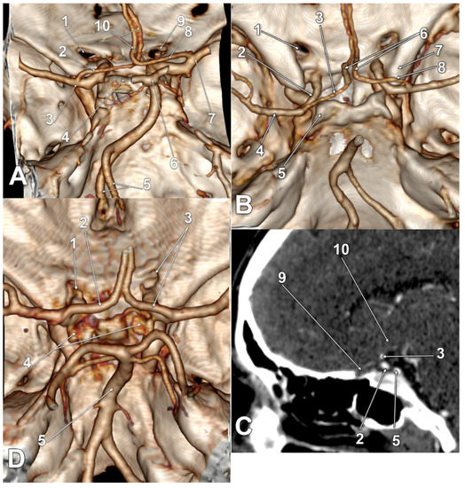 (A) Three-dimensional volume rendering of the skull base, right posterosuperior view. Bilateral supracarotid and infrachiasmatic anterior cerebral arteries. 1. Left optic canal; 2. A1 segment of the left anterior cerebral artery; 3. left internal carotid artery bifurcation; 4. dorsum sellae; 5. twisted vertebral arteries; 6. basilar artery bifurcation; 7. right internal carotid artery bifurcation; 8. A1 segment of the right anterior cerebral artery; 9. right optic canal; 10. twisted A2 segments of the anterior cerebral arteries. (B) Three-dimensional volume rendering of the skull base, posterosuperior view. (C) Sagittal slice through the right optic nerve of the case in (B). Posteriorly displaced carotid bifurcations and resulting infraoptic A1 segments of the anterior cerebral arteries. 1. Left optic nerve canal; 2. left internal carotid artery; 3. infraoptic A1 segment of the left anterior cerebral artery; 4. left middle cerebral artery; 5. left posterior clinoid process; 6. prechiasmatic A2 segments of the anterior cerebral arteries; 7. right anterior clinoid process; 8. infraoptic A1 segment of the right anterior cerebral artery; 9. left optic nerve; 10. optic chiasm. (D) Three-dimensional volume rendering of the skull base, posterosuperior view. Posteriorly displaced carotid bifurcations and resulting infraoptic A1 segments of the anterior cerebral arteries. 1. Left ophthalmic artery; 2. A1 segment of the left anterior cerebral artery; 3. right optic canal, A1 segment of the right anterior cerebral artery; 4. posterior clinoid processes; 5. basilar artery.