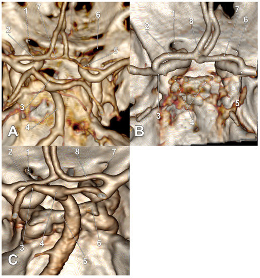 (A) Three-dimensional volume rendering of the skull base, posterosuperior view. Supracarotid infraoptic anterior cerebral arteries. Rotated anterior communicating artery. 1. Left optic canal; 2. A1 segment of the left anterior cerebral artery; 3. dorsum sellae; 4. basilar artery; 5. hypoplastic A1 segment of the right anterior cerebral artery; 6. right optic canal; 7. rotated anterior communicating artery. (B) Three-dimensional volume rendering of the skull base, posterosuperior view. Supracarotid infraoptic anterior cerebral arteries. 1. Left optic canal; 2. A1 segment of the left anterior cerebral artery; 3. left internal carotid artery bifurcation; 4. posterior clinoid processes; 5. right internal carotid artery bifurcation; 6. right optic canal; 7. A1 segment of the right anterior cerebral artery; 8. fenestrated anterior communicating artery. (C) Three-dimensional volume rendering of the skull base, posterosuperior view. Supracarotid infraoptic anterior cerebral arteries. Rotated basilar artery bifurcation. 1. Left optic canal; 2. A1 segment of the left internal carotid artery; 3. left posterior cerebral artery, angled at 0.16 cm posterior to the ipsilateral A1 segment; 4. basilar artery bifurcation at 1.06 cm above the dorsum sellae; 5. dorsum sellae; 6. right posterior clinoid process; 7. right optic canal; 8. A1 segment of the right anterior cerebral artery.