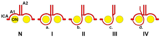 Wong’s types of anterior cerebral artery (ACA) in relation to the optic nerve. N: normal anatomy, the A1 (precommunicating) segment leaves the internal carotid artery (ICA) and has a supraoptic course to further continue with the A2 (postcommunicating) segment. Type I: The A1 segment has a supraoptic course, but an additional collateral (a) has an infraoptic course—it could be regarded as an ICA–ACA anastomosis. Type II: single, infraoptic A1 segment (b). Type III: in the absence of a contralateral A1 segment, the infraoptic artery becomes an infraoptic azygos ACA (c). Type IV: an infraoptic accessory ACA (d) is added to a normal ACA. Modified after [19].