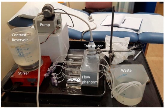 Experimental Set-up. Transducer mounted using retort stand on flow phantom. Contrast diluted in reservoir, then pumped into flow phantom.