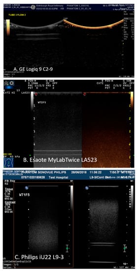 where ρ is equal to the density of the water (1000 kg m−3), µ is the viscosity (1 mPa.s) and v is the velocity in m s−1. Values for the minimum inlet lengths required are shown in Table 1. Three tubes were of internal diameter (ID) 1.6 mm and the remaining three of ID 3.2 mm. Tubes of each diameter were centred at depths of 1, 5 and 8 cm from the surface of the tank (0.5, 4.5 and 7.5 cm from the surface of the tissue-mimicking material—TMM) and off-set from each other so that only one pipe was visible in the scanning plane. A system of three-way taps was attached to the end of each of the tubes to enable the contrast solution to be pumped into each of them. Once the tubes were in position, the tank was then filled with an IEC agar-based TMM [11,12], to a depth of 0.5 cm below the top of the tank. The TMM was then left to set overnight. The properties of this TMM are well documented by ourselves and others up to frequencies of 60 MHz [13,14]. After the TMM was set, TMM maintenance fluid, a combination of glycerol, water and antibacterial fluid (speed of sound 1540 m s1), was poured onto the top of the phantom [15] and the phantom was covered by cling film to ensure the TMM did not dry out. The experiments described below were undertaken over a period of three months, during which there was no evidence of degradation of the phantom. All scanning experiments were undertaken in clinical radiology departments (GE Logiq E9), in University of Edinburgh veterinary radiology departments (Esaote MyLab Twice) or in biological research facilities (Philips iU22, FujiFilm Visualsonics Vevo 3100) in light levels similar to those used for clinical examinations (Figure 1).