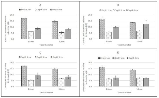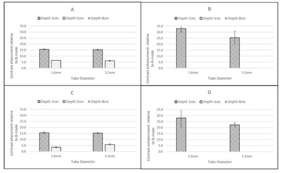 Ratio of backscatter signal in contrast-specific imaging mode to B-mode using a GE Logiq9 C2-9 probe for (A) SonoVue at a flow rate of 0.25 mL/s; (B) DEFINITY® at a flow rate of 0.25 mL/s; (C) SonoVue at a flow rate of 1.5 mL/s; (D) DEFINITY® at a flow rate of 1.5 mL/s. Error bars are standard deviations.