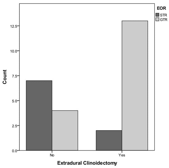 Regarding the first objective of the present study—namely the EOR analysis in EC patients, as previously stated—Simpson I in CMs are not always feasible. Rather, it is impossible to completely remove the basal dura surrounding the ACP, and therefore a safe removal with, or even without, coagulation of the dural attachment (Simpson 2 or 3, respectively) may also be considered as a GTR, because the bulk of the tumor is resected and no macroscopic residual is left in situ. In the case of macroscopic tumor residuals, in respect to the anatomical relationship with the arteries, optic nerve, and/or the cavernous sinus, tumor removal was considered to be partial (Simpson 4). Our results highlight that: In group A (where EC was performed), we obtained a GTR in 13 patients (Figure 1 and a STR in 2 patients (Simpson 4); conversely, a GRT was reached in 4 patients from group B (where EC was not performed), with a partial asportation in 7 patients. To summarize, of those patients who underwent extradural clinoidectomy, a total resection of the tumor was achieved in 86.7%, whereas of those who did not undergo EC, a total resection of the tumor was achieved in 36.4%. As such, this data reaches the threshold for statistical significance (F = 0.0135, Figure 1).