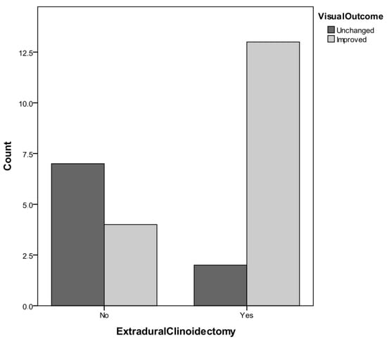Regarding the second aim of the study, our results outline that: In Group A (where EC was performed), 12 patients experienced an improvement of visual function and 3 patients were unchanged, whereas in group B (where EC was not performed), 4 patients experienced improved visual function postoperatively, and 7 patients were unchanged. Practically, 80% of the patients who underwent EC experienced a better visual outcome, whereas 36.4% of the patients who did not undergo EC achieved an improved visual outcome. Moreover, this result also reached the threshold for statistical significance (F = 0.0426, Figure 2).