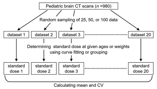 Standard doses were estimated by applying the curve-fitting and grouping methods to each dataset. For the curve-fitting method, CTDIvol was plotted against age or weight, and logarithmic, power, and bilinear functions were fitted to the plots using Microsoft Excel, to determine equations for CTDIvol estimation. The cutoff in bilinear fitting was set to 1.5 years or 15 kg. Standard doses at 0.25, 1, 5, 10, and 15 years and at 3, 10, 20, 40, and 60 kg were calculated by substituting the age or weight value into the equation. For the grouping method, the standard dose was determined as the median of CTDIvol for the 0–<0.25, 0.25–<1, 1–<5, 5–<10, and 10–<15 years age groups and for the 0–<5, 5–<15, 15–<30, 30–<50, and 50–<80 kg weight groups. The standard dose for an age or weight group was determined even when only one datum was available for the group. Among the 20 datasets of a given sample size, the mean (mGy) and coefficient of variation (CV, %) of the standard dose were computed.