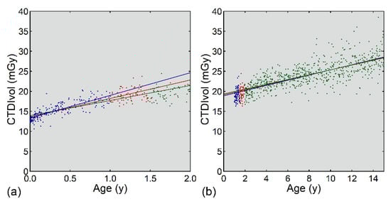 Linear regression analysis of CTDIvol and age for <2 years (a) and ≥1 year (b). In panel (a), the blue, red, and green plots represent data of 0–<1, 1–<1.5, and 1.5–<2 years, respectively. In panel (b), the blue, red, and green plots represent data of 1–<1.5, 1.5–<2, and 2–<15 years, respectively. The blue, red, and green lines are regression lines determined using young/old cutoffs of 1, 1.5, and 2 years, respectively. For example, with a cutoff of 1.5 years, linear regression was performed using the blue and red plots in the young range (a) and the red and green plots in the old range (b).