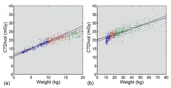 Linear regression analysis of CTDIvol and weight for < 20 kg (a) and ≥ 10 kg (b). In panel (a), the blue, red, and green plots represent data of 0–<10, 10–<15, and 15–<20 kg, respectively. In panel (b), the blue, red, and green plots represent data of 10–<15, 15–<20, and 20–<80 kg, respectively. The blue, red, and green lines are regression lines determined using light/heavy cutoffs of 10, 15, and 20 kg, respectively.