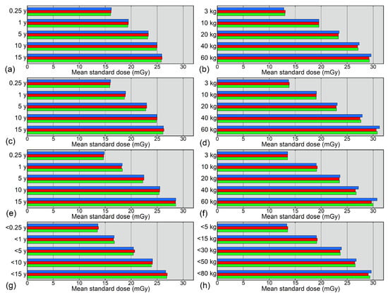 Mean standard doses estimated based on age (a,c,e,g) or weight (b,d,f,h). Standard doses were estimated using logarithmic fitting (a,b), power fitting (c,d), bilinear fitting (e,f), and grouping (g,h). The blue, red, and green bars represent values for small, medium, and large datasets, respectively.