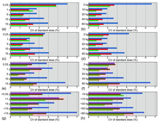 CVs of standard doses estimated based on age (a,c,e,g) or weight (b,d,f,h). Standard doses were estimated using logarithmic fitting (a,b), power fitting (c,d), bilinear fitting (e,f), and grouping (g,h). The blue, red, and green bars represent values for small, medium, and large datasets, respectively.