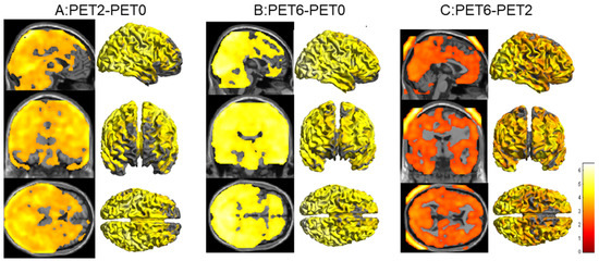 Furthermore, brain glucose metabolism was higher in the PET6 scan than in the PET2 scan for the whole brain, excluding the bilateral white matter around the ventricles, brainstem, and cerebellum (Figure 1C).
