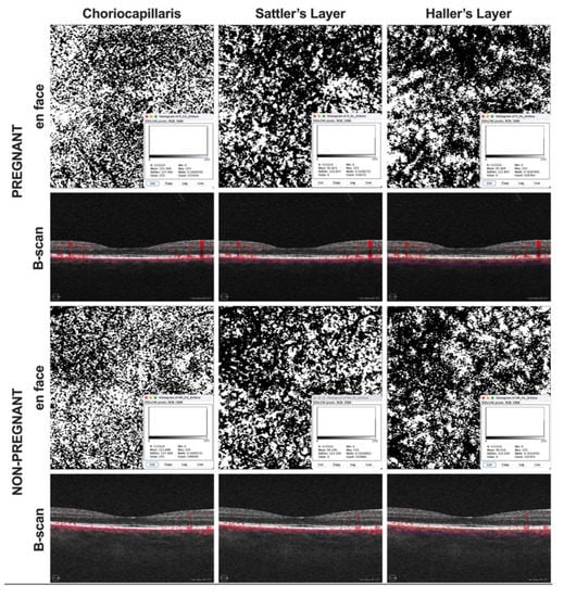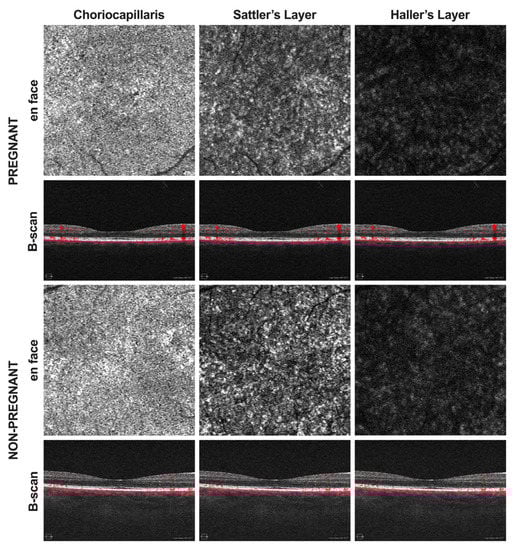 Optical coherence tomography angiography (OCTA) images were acquired in pregnant as well as non-pregnant women. En face angiograms and corresponding B-scans of the choriocapillaris, Sattler’s layer, and Haller’s layer were generated using the CIRRUS 5000 OCT device with AngioPlex software. En face images were then processed for quantitative analysis using ImageJ.