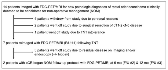 To this point, a recent study suggested that FDG-PET/MRI may be more accurate than MRI alone for predicting residual viable tumor among rectal cancer patients undergoing TME following neoadjuvant therapy [9]. However, the utility of FDG-PET/MRI for response assessment in the NOM setting has not been established. Thus, the objective of this pilot study was to determine whether FDG-PET/MRI has the potential to alter clinical response assessments among rectal cancer patients undergoing TNT followed by NOM, relative to MRI alone.