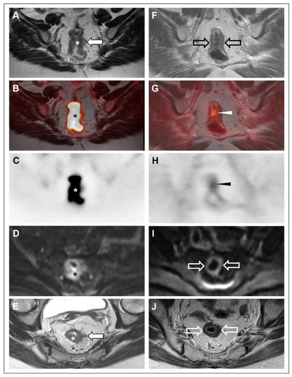 53-year-old woman with rectal adenocarcinoma (Subject #3) underwent FDG-PET/MRI at initial staging (A–E) and following TNT (F–J). Oblique coronal high-resolution coronal T2-weighted images (A,F); oblique coronal high-resolution coronal T2-weighted images with PET fusion (B,G), oblique coronal attenuation-corrected PET images (C,H), axial diffusion-weighted images (b = 1000 s/mm2) (D,I), oblique axial high-resolution T2-weighted images (E,J) are shown. At initial staging, a hypermetabolic, diffusion-restricting mid-rectal mass (*) with tumor extension into the mesorectal fat (closed arrows) was noted, along with several suspicious mesorectal nodes (not shown). Following TNT, there was no definite residual disease on MRI (open arrows). Both readers assigned an mrTRG of 1–2. However, PET showed residual focal hypermetabolism (arrowheads) in the treated area. Both readers assigned a pmrTRG of 2 based on possible residual tumor on PET. Subsequent lower endoscopy revealed a stricture of the treated segment that could not be traversed, though biopsies of the accessible portions were benign. Based on the suspicion of residual disease on the PET, the patient underwent a low anterior resection, with surgical pathology revealing residual disease (ypT2 ypN0).