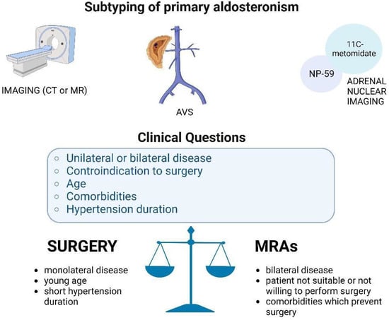 - Mulatero, P.; Sechi, L.A.; Williams, T.A.; Lenders, J.W.; Reincke, M.; Satoh, F.; Januszewicz, A.; Naruse, M.; Doumas, M.; Veglio, F.; et al. Subtype diagnosis, treatment, complications and outcomes of primary aldosteronism and future direction of research: A position statement and consensus of the Working Group on Endocrine Hypertension of the European Society of Hypertension. J. Hypertens. 2020, 38, 1929–1936. [Google Scholar] [CrossRef]
