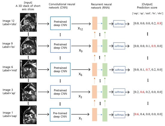 An overview of the proposed method. The input consists of a series of cardiac short axis slice images, which range from the out-of-apical slice level to the out-of-basal slice level. The slice levels were labeled as ‘oap’ for the out-of-apical slice, ‘ap’ for the apical slice, ‘mid’ for the mid-level slice, ‘bs’ for the basal slice, and ‘obs’ for the out-of-basal slice. For each slice image, a pre-trained deep CNN model is used as a feature extractor. The features are denoted by xi for i = 1, 2, …, N, where N is the number of slices. The RNN model takes a series of features (i.e., x1, x2, …, xN) as input and produces probability scores for each slice level via softmax. The red numbers indicate the maximum values in the output prediction scores.
