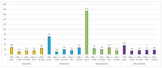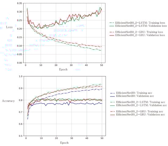 Figure 2 shows an example of learning curves for the case of EfficientNetB0 as a baseline network for deep CNN feature extractor. The training loss functions showed a monotonic decreasing pattern with respect to epoch. The validation loss functions showed a decreasing pattern at earlier epochs up to 10, while it showed an increasing pattern at epochs later than the 10th epoch. The increasing pattern reflects overfitting as expected, and we chose an appropriate epoch number based on the dip of the validation loss functions. This pattern was observed in both the LSTM and GRU networks. The bottom sub-figure illustrates the accuracy curves with respect to epoch. The training accuracy curves kept increasing in all three models, while the validation accuracy curves stayed at an accuracy value with little fluctuation. The cascaded CNN-RNN models (green and red) had relatively higher accuracy than the CNN-alone model (purple). These trends were observed in other base networks of MobileNet, ResNet50V2, and NASNetMobile.