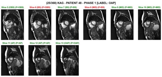 A screenshot of slice level predictions on a series of short axis slices on an individual test subject. The prediction was made by the ‘MobileNet_2layerLSTM’ model. The slice index, the ground truth, and the predicted category are shown above each image. The green text indicates correct classification, while the red text indicates incorrect classification. For example, ‘(BS) (P = OBS)’ indicates that the ground truth is ‘basal’, and the model’s prediction is ‘out-of-basal’.
