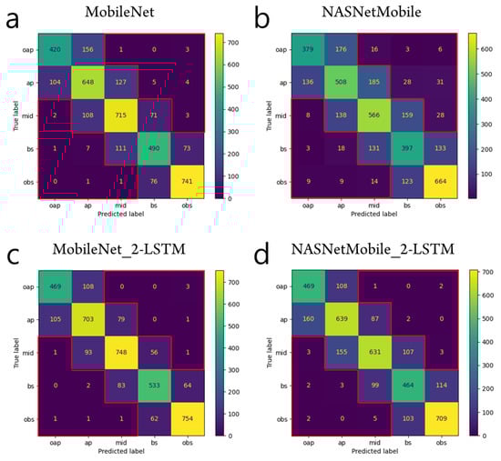 Test prediction results from the CNN-alone models (a,b) and from the CNN-RNN models (c,d). In either MobileNet or NASNetMobile, the CNN-RNN model has smaller sums of the elements out of the tridiagonal entries (SOTD) than the CNN-alone model. The elements out of the tridiagonal entries are indicated by the red contours in the confusion matrices. For example, SOTD is 11 for the case of MobileNet_2-LSTM in (c).