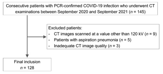 This retrospective study received institutional review board approval, and the requirement for written informed consent was waived. Consecutive patients with PCR-confirmed COVID-19 infection who underwent CT examinations between September 2020 and September 2021 were identified using our hospital information system. Of these patients, 17 were excluded for the following reasons: (1) CT images scanned at a value other than 120 kV (n = 9), (2) patients with aspiration pneumonia (n = 5), and (3) an inadequate CT image quality (e.g., presence of severe motion artifacts preventing the adequate assessment of CT findings) (n = 3). The flowchart for patient selection is shown in Figure 1. Ultimately, 128 patients (male, n = 80; female, n = 48; mean age, 55.4 ± 20.6 [range, 14–97] years old; nine teenagers, seven in their 20s, ten in their 30s, twenty-six in their 40s, twenty-four in their 50s, seventeen in their 60s, seventeen in their 70s, fourteen in their 80s, and four in their 90s) were included in the present study.